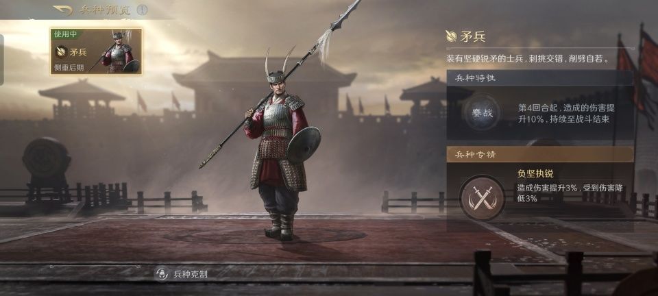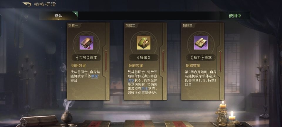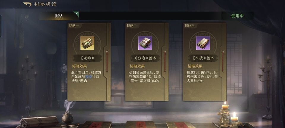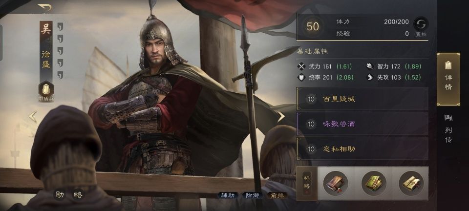 关平战法:龙吟四海+疾行侧击+迎敌。韬略库:龙吟(专属)+分治善本+久战善本。矛兵特性鏖战,专精点亮负坚执锐。众所周知,关羽的威震华夏想要发挥得好,必须吃满畏惧。由于我目前手里头没有张飞,只能让关平顶上去,好在关平的专属战法和金书都能加畏惧,勉强也算得上是个低配版的张飞。