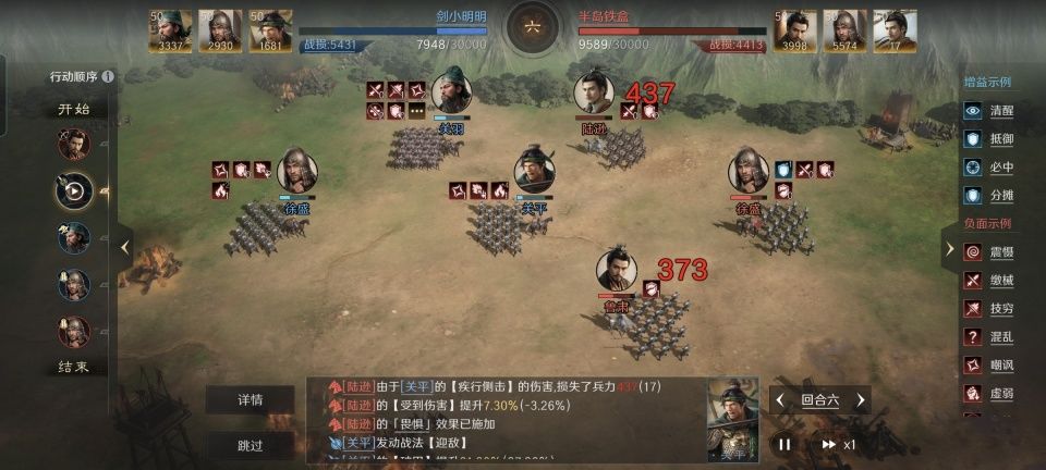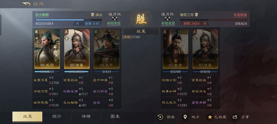 我自己打的,就不存在啥特别鸣谢了。关羽、关平被我安排在了偃月阵的前排,徐盛被放到了后排,遭遇了陆逊、鲁肃和徐盛的肉都督队,本不抱太大的希望,却没想到打赢了。咱这边可是浑身上下顶着负面buff,怎么就咬着牙把陆逊给劈了呢?所以我专门把细节整理在了下文的段落,既是想给各位看看,也是给自己复个盘。