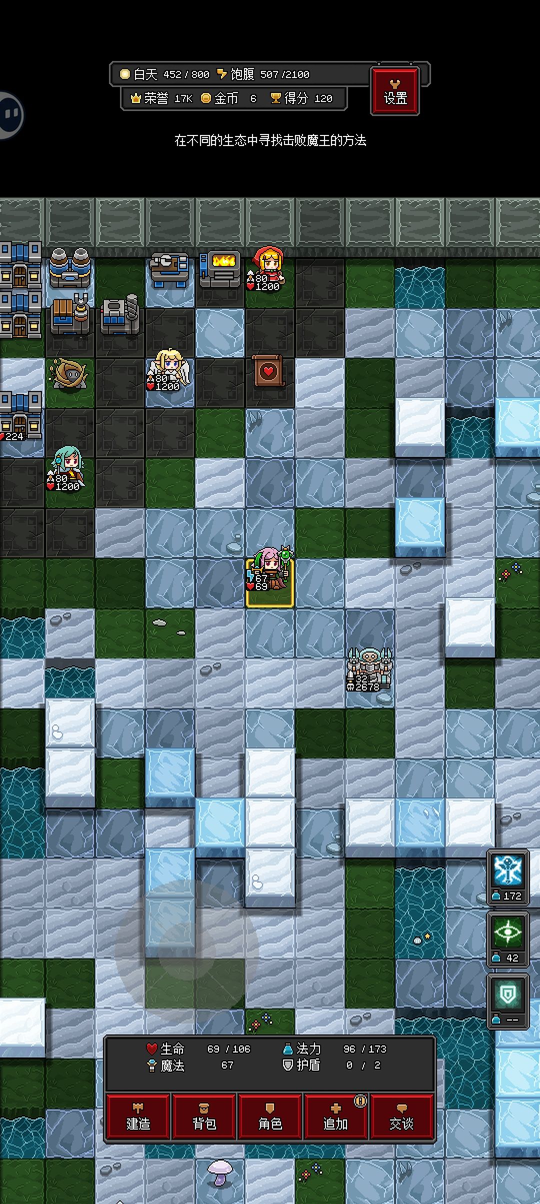 虽然我们全加了攻击,但是血量也高达100出头了,挂机回复一次5滴血。这意味着什么呢?我们可以采取卡小boss的方式(如上图),不让他分裂,他一次4攻击我们一次回5滴,随便刮刮也就抬走了。