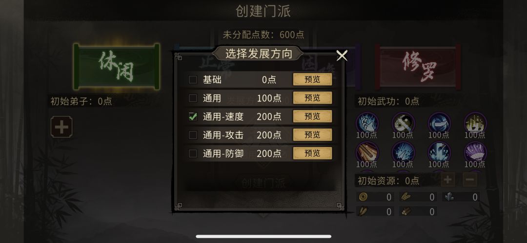 开局帮捕头,休闲难度,门派800点,速度发展方向,弟子刘十八、包打听,武功选七杀枪法、横练金身、纯阳功、海纳百川,不加初始资源