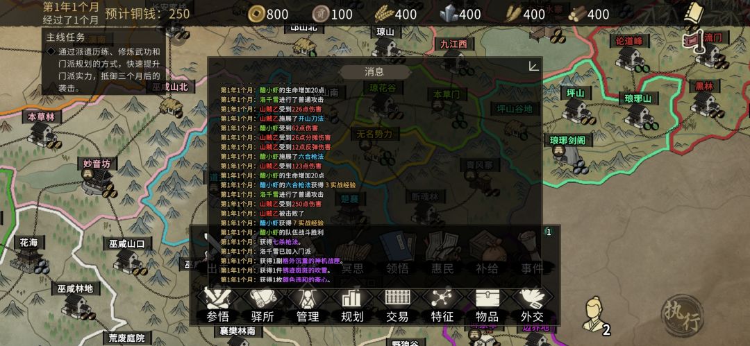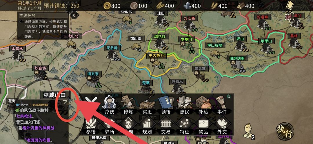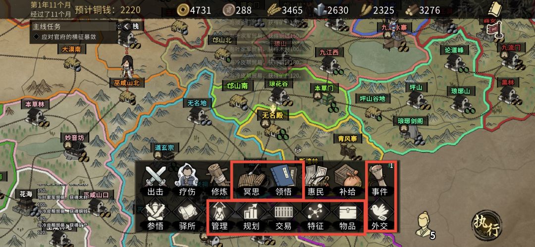 刚开局有用的按钮:事件(历练和剧情必做)、冥思(每月必做,聊胜于无)、领悟(主角和捕头尽量先学个内功加点蓝量)、物品(历练回来必点)、规划(执行后一遍,历练后一遍)、外交(贸易、送礼)管理(捕头必先晋升突破等级上限)特征(规划里解锁了就及时装备上)交易(需要先在规划里解锁,兑换资源,买丹药)参悟(冥思点多的当月用不完时可以SL合一下)