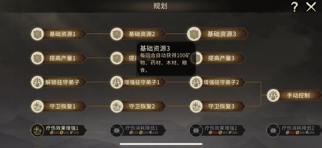 8、规划,建议优先点满资源和产量,然后是自动恢复以及特征(解锁伺机而动就可以缓一缓)接着是实战经验和驻守弟子及恢复,第三个月要点资源商人,点了下个月就买药补一下主角状态,不然下个月状态不好可能打不过清风寨(主角单挑即可)其他的影响不大