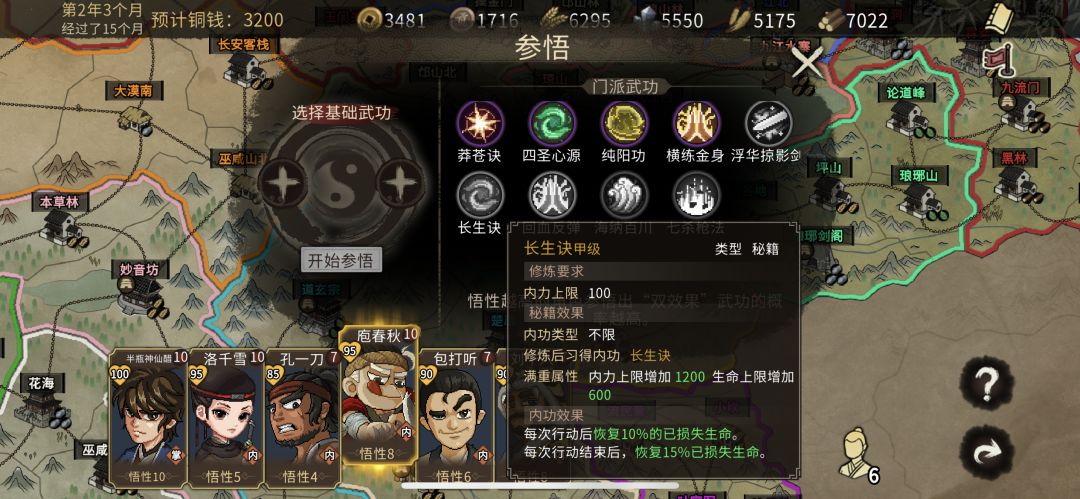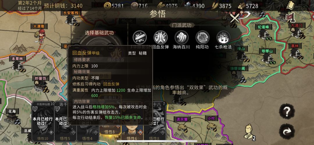 16、参悟是不消耗角色当月行动次数的,冥思富裕的话可以随便合,建议优先合回血内功,参悟之前先存档,SL出双属性,如果有 特征不世之才 就给悟性高的装备上,成功率会大大提高(刷冥思同理)