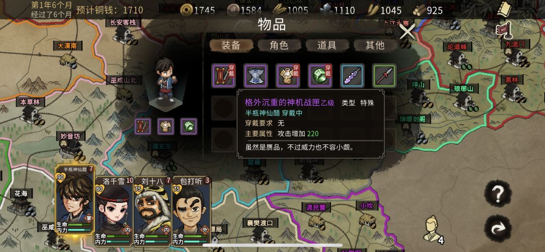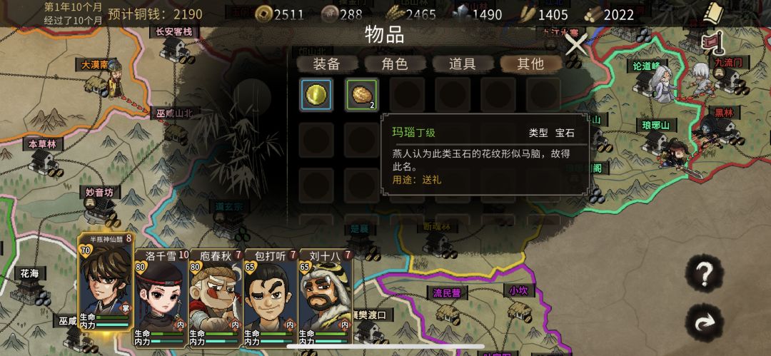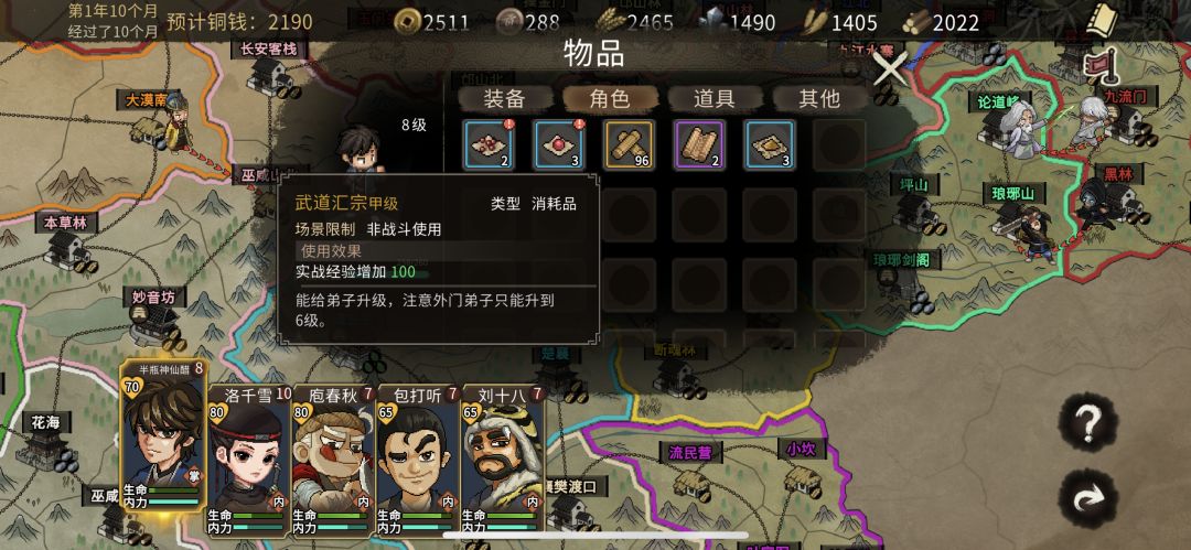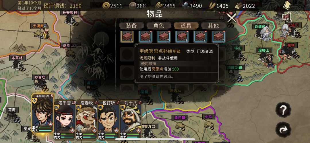 9、铜币不要送礼,解锁商人后尽量留400~600以上买点回血回蓝的药,前期保证每天历练的角色状态保持在70%左右,最好不要低于50%,不然容易翻车