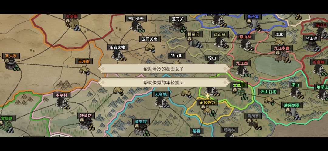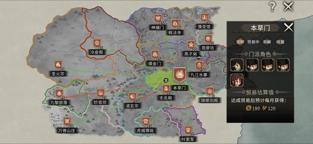 2、开局本草门、道玄宗、叶家军、虎威镖局好感度都是20以上的,记得在外交里一一把贸易点了,收益挺不错的