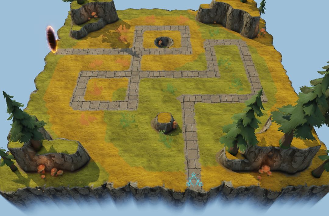 第二关,作为阴的关卡,与阳相对的自然选择了晚上作为环境氛围,增加些许萤火虫和点光源增加气氛,同时路径也是围绕着太极做的曲线。