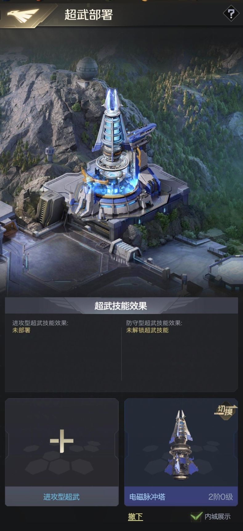2.超级武器的专属技能只有在部署后才能生效,指挥官可部署 1个战略进攻型超级武器和 1 个战略防守型超级武器,当前游戏内只解锁了战略防守型的电磁脉冲塔,后续解锁后,对付步兵的话建议部署弹道发射器,对付空军的话建议部署雷电控制仪。当然后续肯定还会陆续上线新的超级武器,有新的再和大家交流。