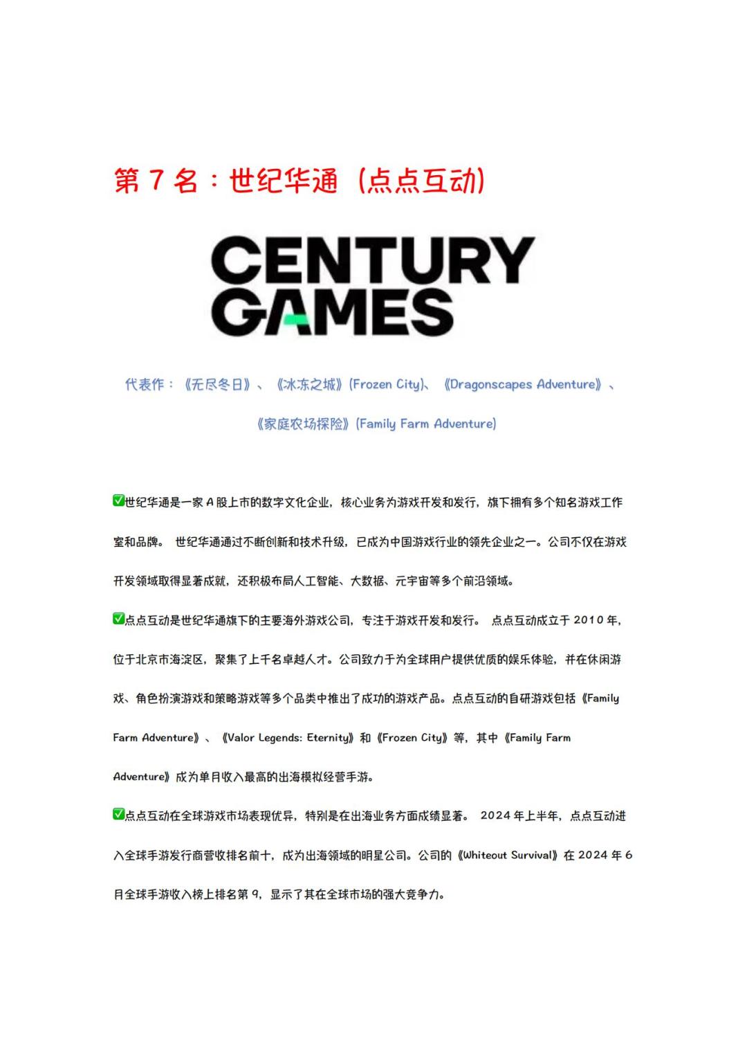第7名:世纪华通(点点互动),代表作:《无尽冬日》、《冰冻之城》(Frozen City)、《Dragonscapes Adventure》、《家庭农场探险》(Family Farm Adventure)