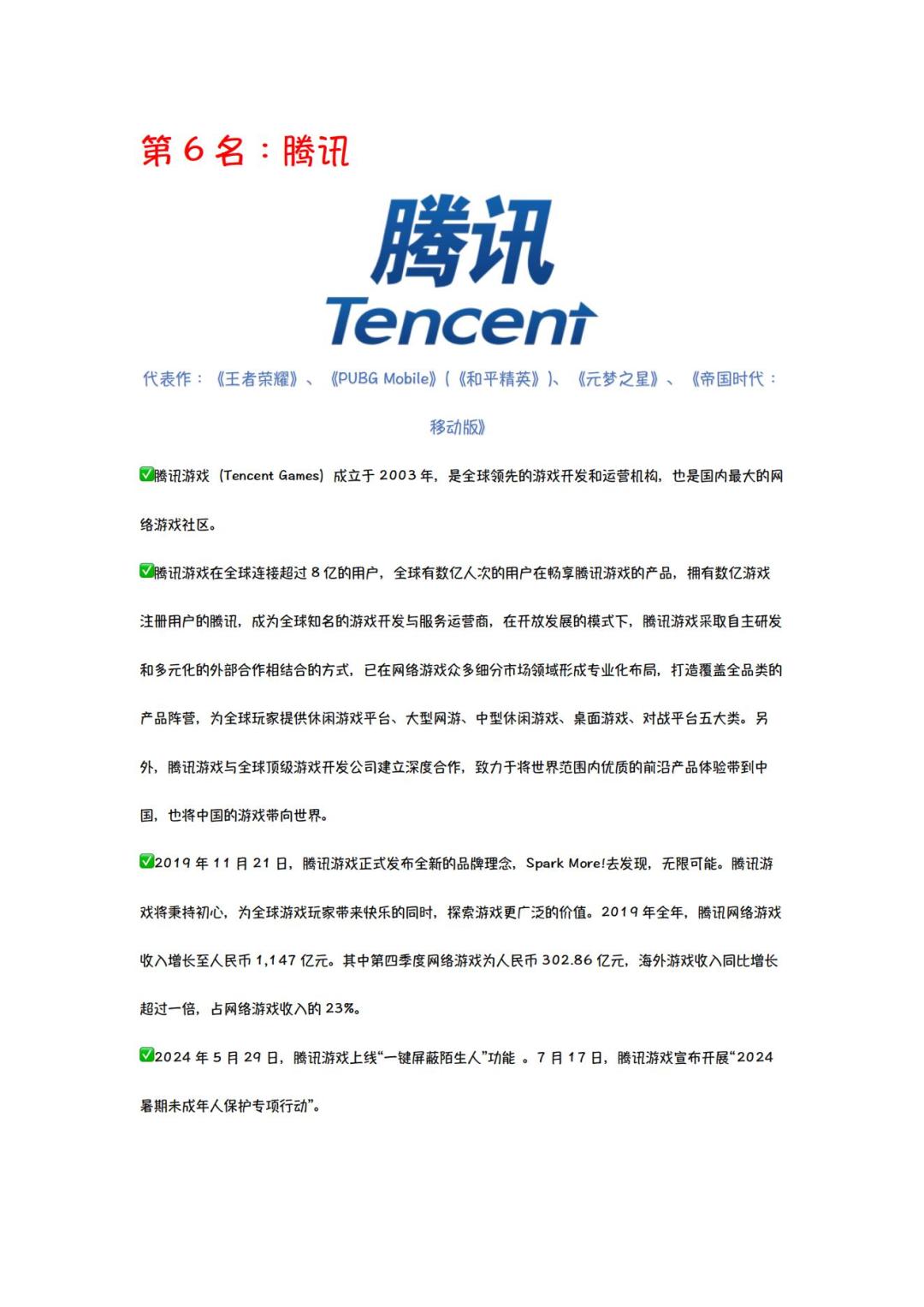 第6名:腾讯,代表作:《王者荣耀》、《PUBG Mobile》(《和平精英》)、《元梦之星》、《帝国时代:移动版》