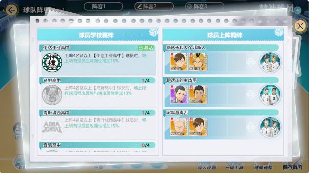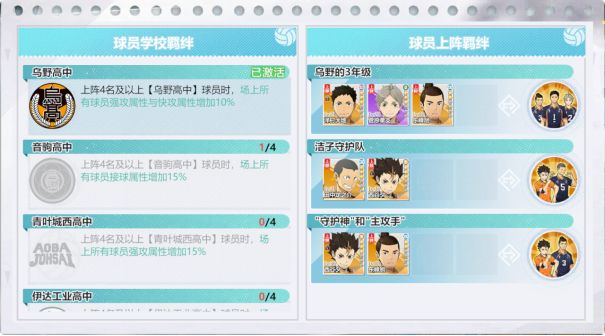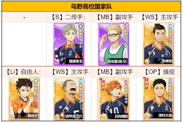 首先给大家推荐的是个人觉得泛用性最强的乌野队。该队伍的成员大部分来自于乌野高中,可以触发四种强力羁绊,带来可观的团队增幅。