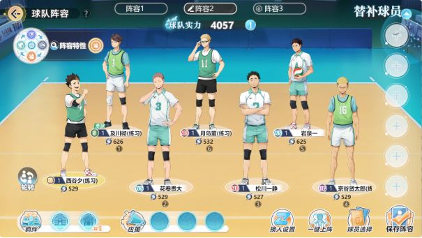 在「青叶城西队」中,核心角色「及川彻」和「岩泉一」的配合能够发挥出极高的效果,特别适合平民玩家。这支队伍依靠「及川彻」的强攻属性二传手特性,不断增幅主攻手「岩泉一」的暴击能力和输出伤害。