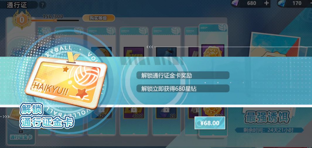 花费68元购买等价值星钻货币,获赠通行证金卡,可获得1800代币