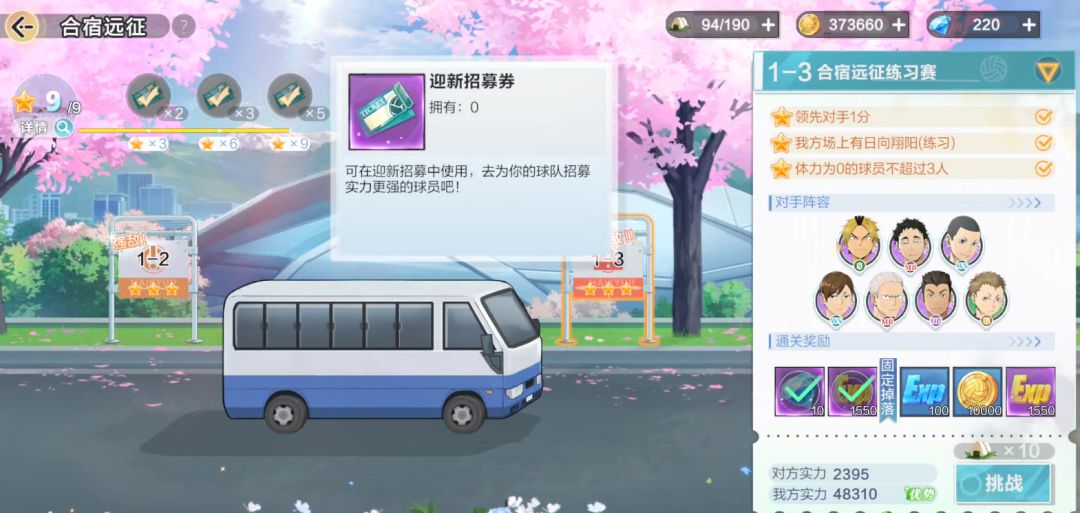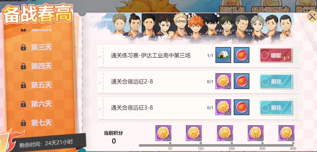 该活动在玩家等级达到6级时开启,对应主线挑战<合宿远征>大约第二章节三关左右,活动开启的25天期间将持续赠送抽奖代币最低可获取130抽!(还赠送28张高级招募券,4<通票>+8张追忆招募券)。160抽必定获得ssr<日向翔阳>