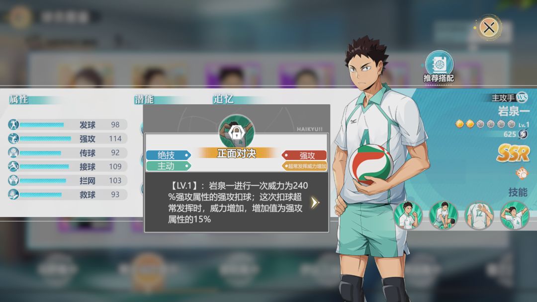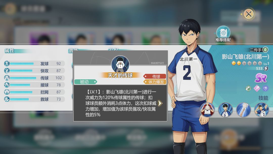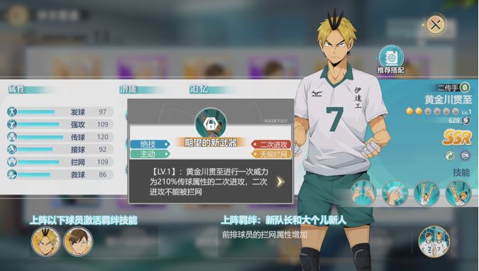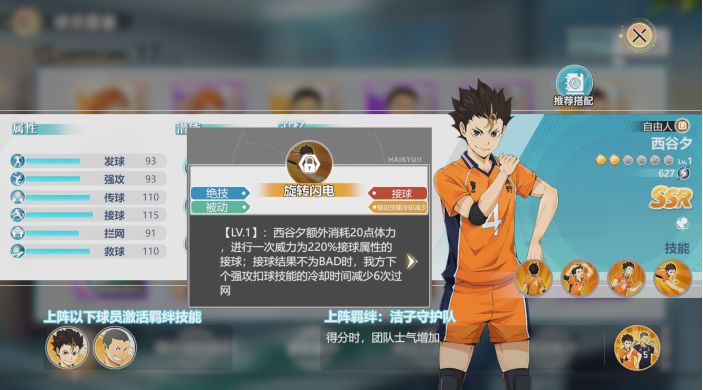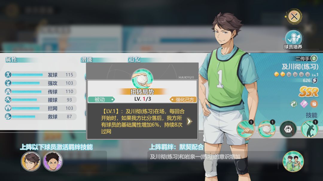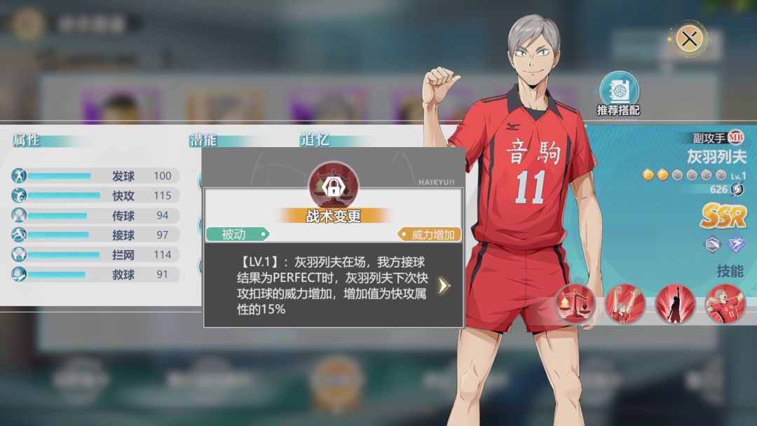 灰羽列夫是音驹高中唯一的SSR,拥有比较特殊的DEBUFF体系技能,未来有极大的发展空间。