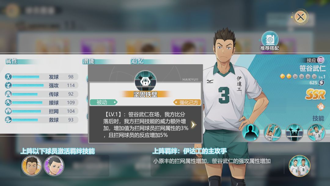 青根高伸虽然是副攻手,主要属性不是进攻,而是防御。他的技能、羁绊均是围绕拦网展开,能够周期性提升队伍的拦网属性。青根高伸需要比较完整的伊达工业队员,从而触发羁绊效果。