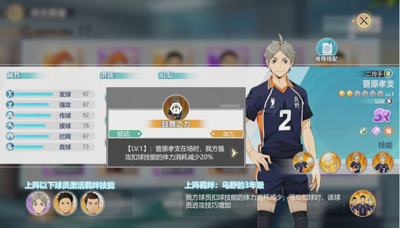 菅原孝支的羁绊效果是乌野的3年级,大幅度降低进攻的体力消耗,同时增加强攻的输出能力,十分适配乌野队。