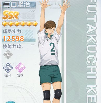 伊达工业高中的队长,二口坚治是一名专注于拦网的辅助角色。他的被动技能可以显著提升全队的拦网属性,是防守队伍中的关键成员。