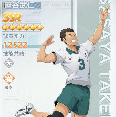 笹谷武仁为专门为青叶队增幅的角色,他所提供的增幅大多都是防御属性,在落后比分时,可以进一步提升我方的拦网威力,由于是接应角色,整体综合能力还是蛮强的,可以兼顾很多的功能性。(可以兼任:拦网、接球、传球、扣球)