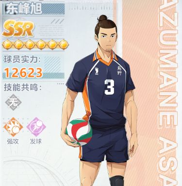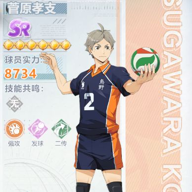 前期非常实用的强攻二传手,SR的身份比较容易升技能共鸣。菅原孝支基本是必养的角色,加上归属于乌野高中,在开服时期羁绊非常好凑。辅助的技能数值也给的相当慷慨,能有效减少扣球的体力消耗,与东峰旭有着相当良好的配合。