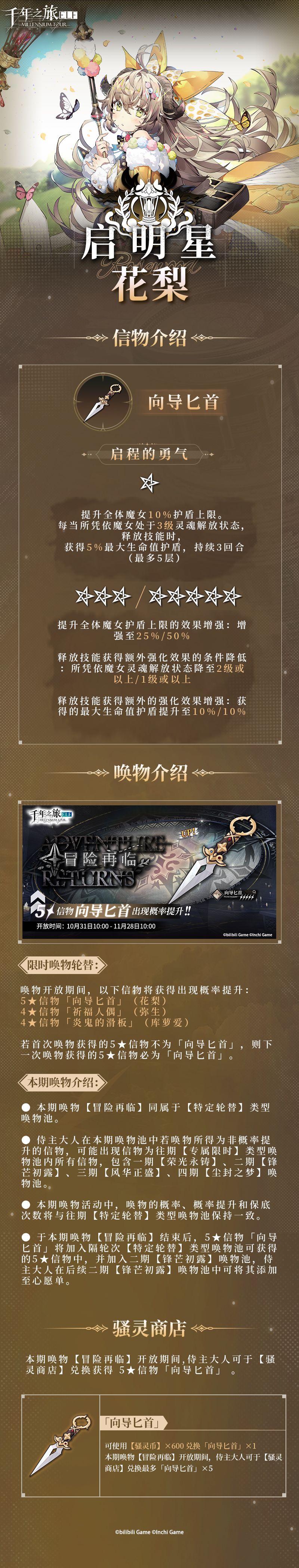 于本期唤物【冒险再临】开放期间,侍主大人可于【骚灵商店】兑换获得5★信物 向导匕首(花梨)。