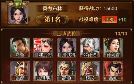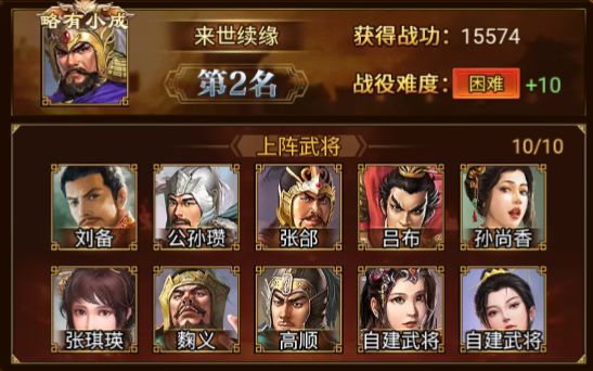 刘备、公孙瓒、张郃、张琪瑛、高顺、孙尚香、麴义、吕布、自建武将*2