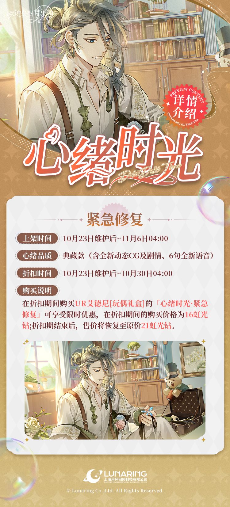 - 售价:在折扣期间购买「心绪时光·紧急修复」可享受限时优惠,在折扣期间的购买价格为16虹光钻,折扣期结束后,售价将恢复至原价21虹光钻。