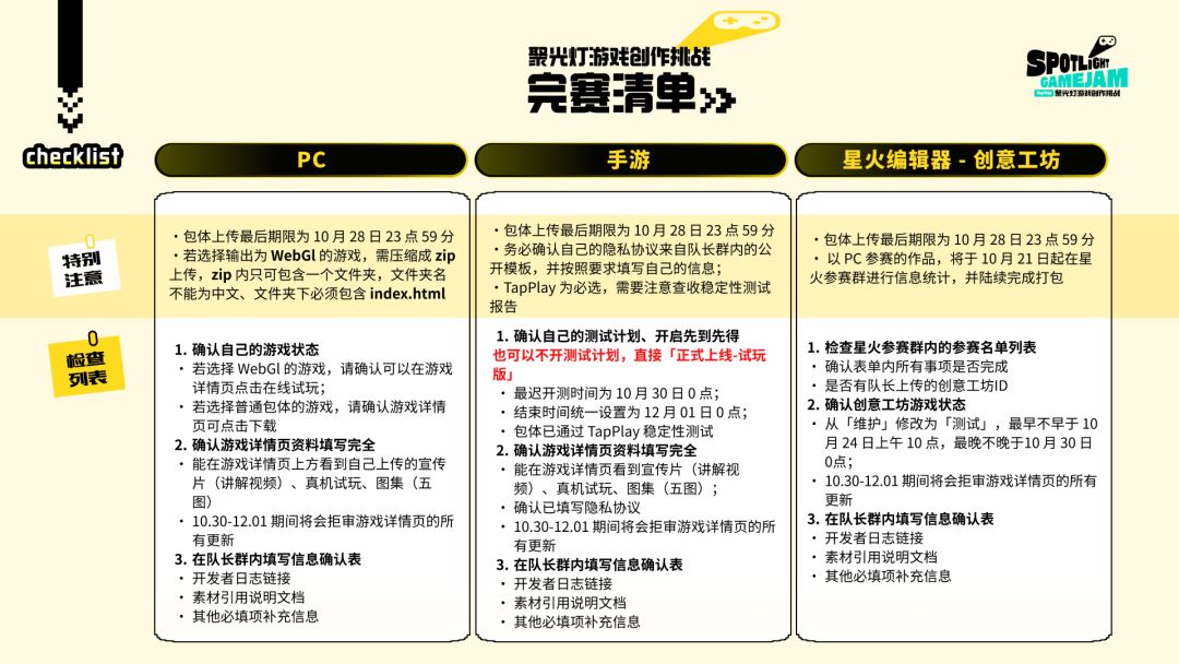 聚光灯 GameJam 完赛清单❗️包体上传 10.28 23:59 截止❗️