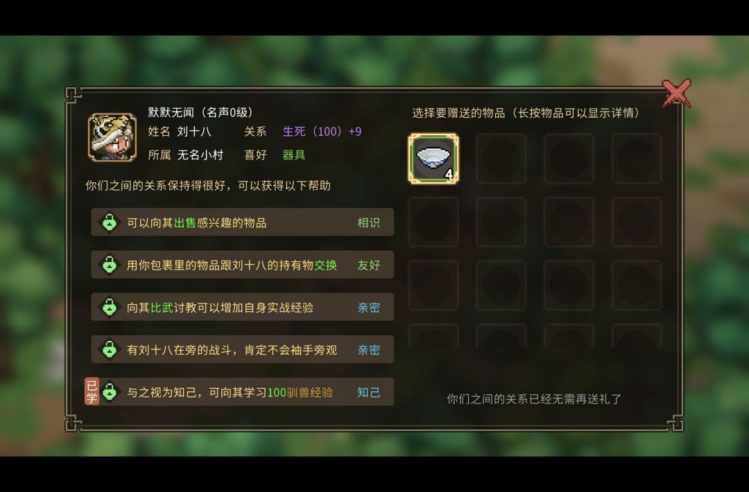 现在的情现在的情况就是。我已经做完消宝的那个传闻了,但是他依然还存在,没有显示已完成。而且红色樱桃树下也没有灵芝了。也触发不了刘十八的那个传闻。我还以为是亲密度不够的问题,结果我把亲密度刷满之后,他也没出那个任务。所以我的刘屠户真的不能邀请到了吗?