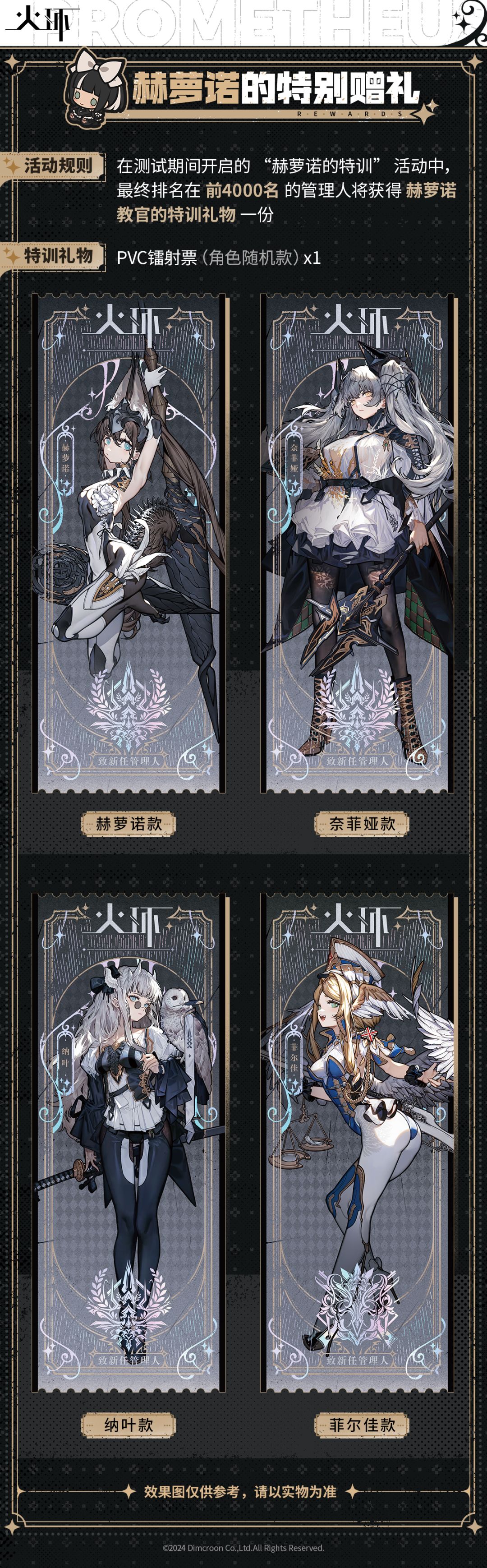 焕火测试期间,各位管理人阁下可以通过参与游戏内限时活动“赫萝诺的特训”活动以获取积分,我们将为最终排名前4000的管理人赠送特别赠礼。