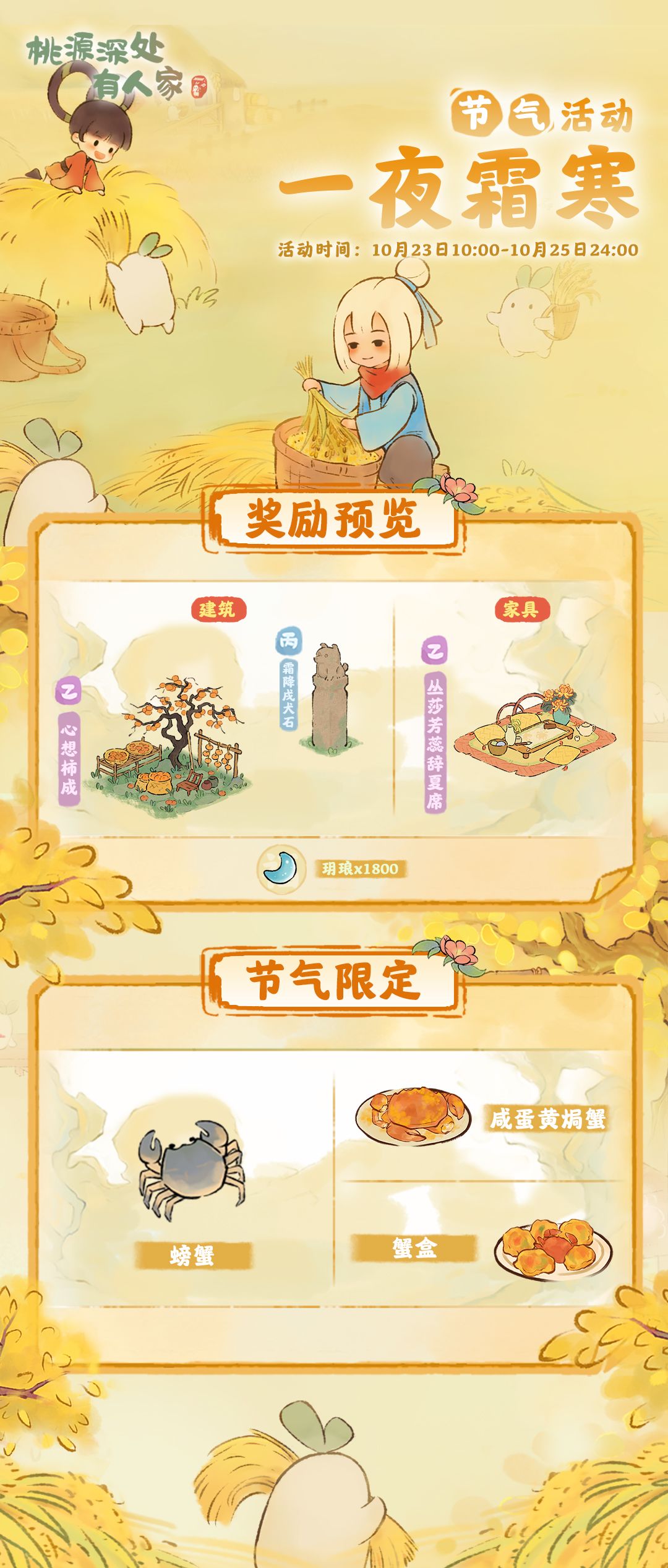 各位萝萝山的山民好呀!霜降节气即将到来,届时昼夜温差变化大,各位山民要注意防寒保暖萝。小花今日带来了霜降节气活动的预告哟~