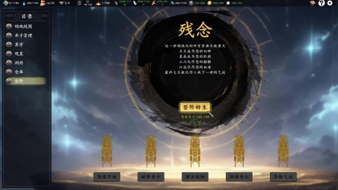 在这个竞争酷烈的末世中,通过登阶仪式,您得以解锁巨额的全局加成,并使下个世界更加繁荣。