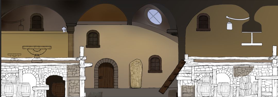 10月19日:天又塌了……老师们画了好几天酒馆场景,原本计划的一共6关场景制作时间上完全不够,我们重新讨论改为只画一章场景,每关只更改交互物和平台