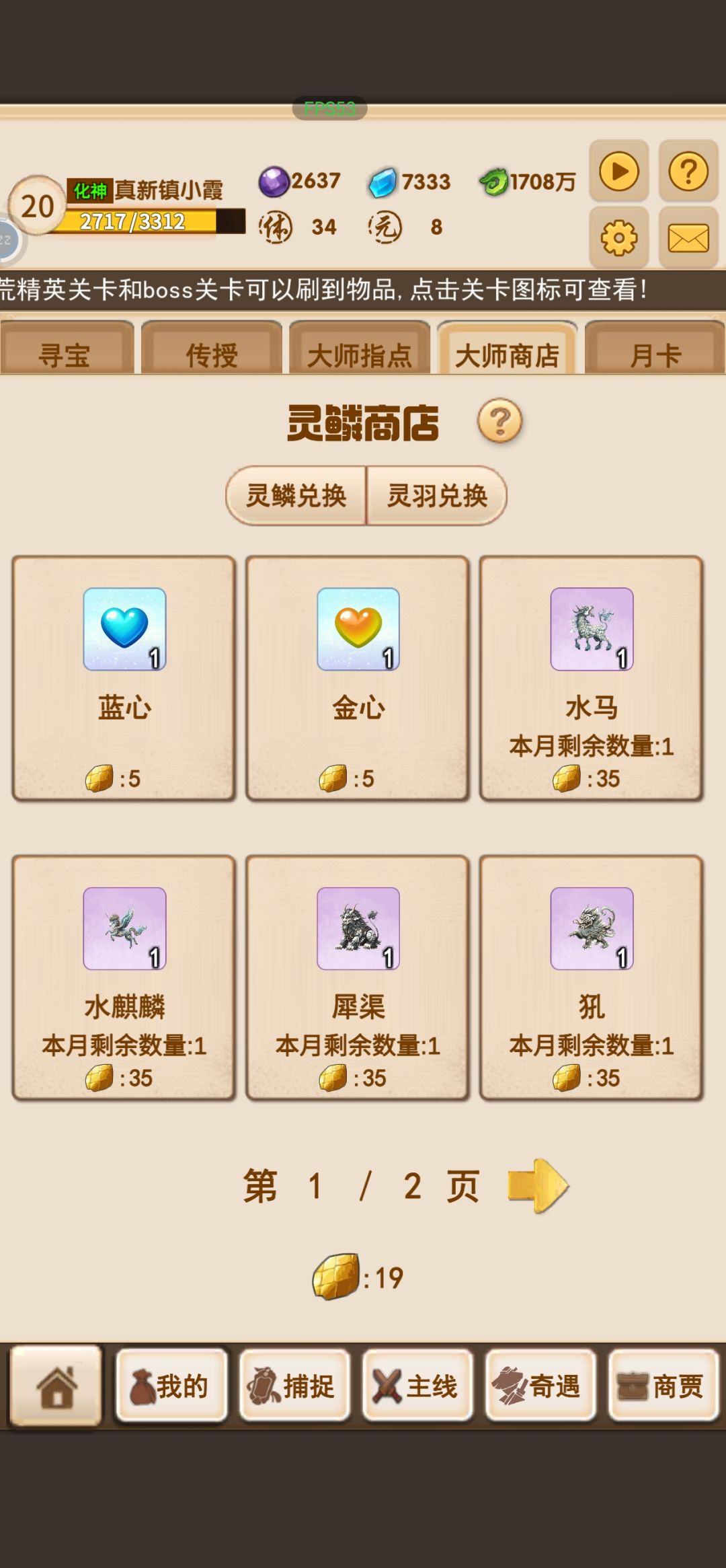 大师商店灵鳞灵羽可以在灵兽秘境旁边的问号里查看怎么获得,大师商店里要换什么建议换蓝心金心,具体情况按自己的来。