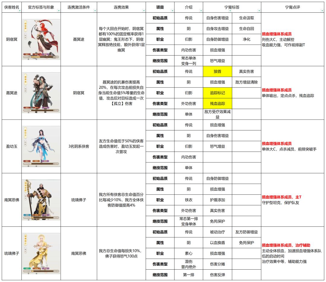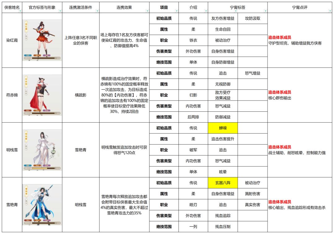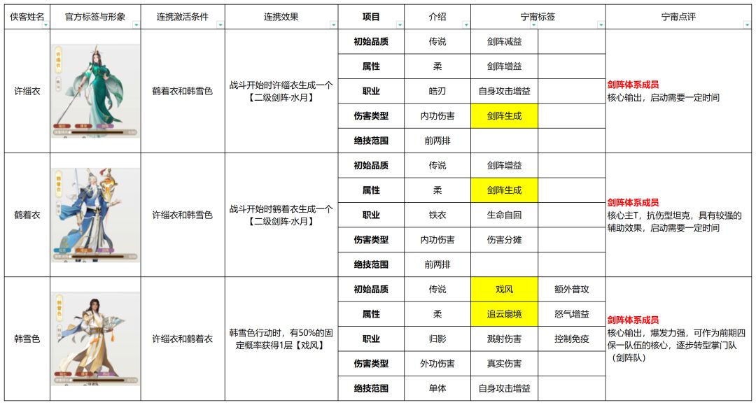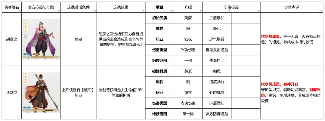 - 角色词条:以侠客特有增益效果或减益效果命名,如【水诣】【真·水诣】【戏风】等;图表中用“金色“进行标注,具体细节将会在共享表中展示