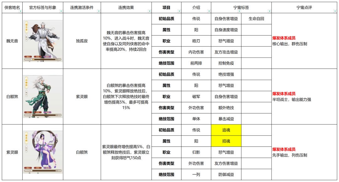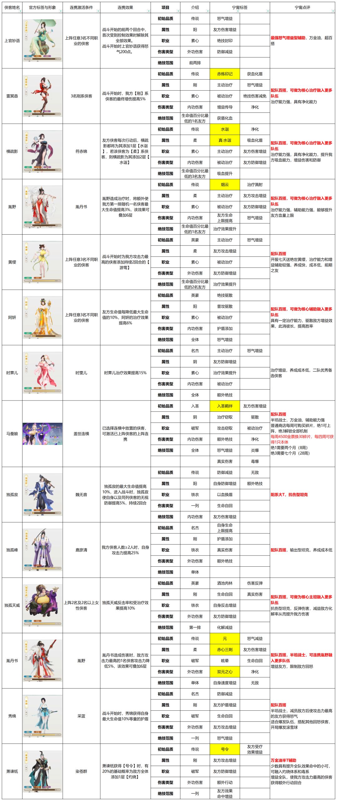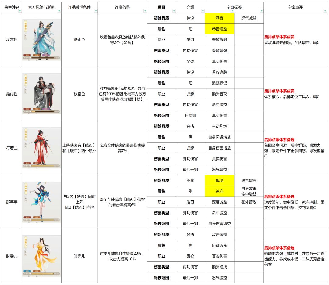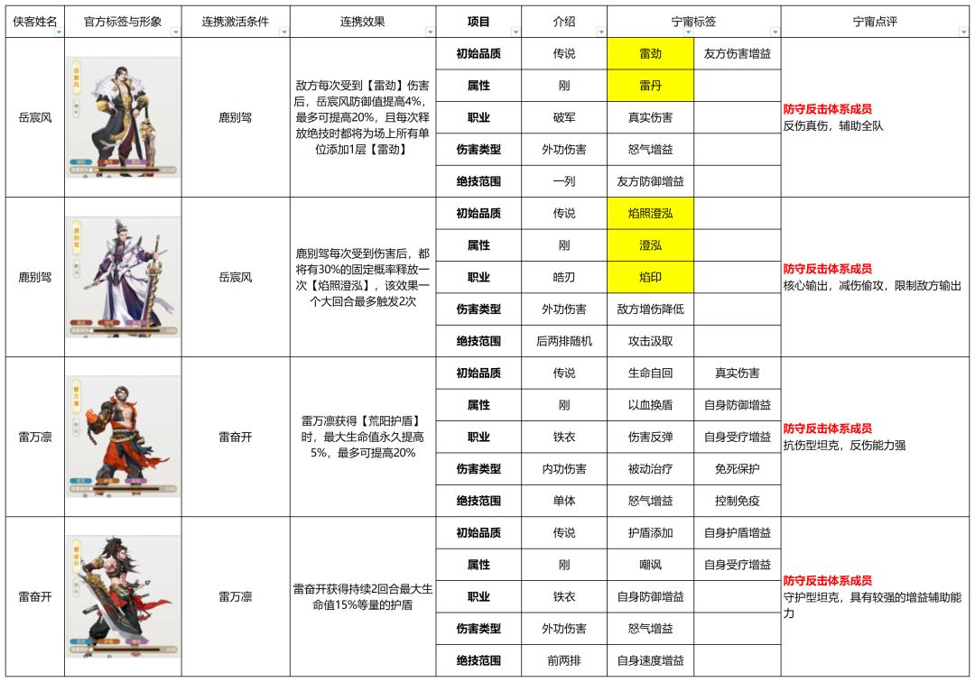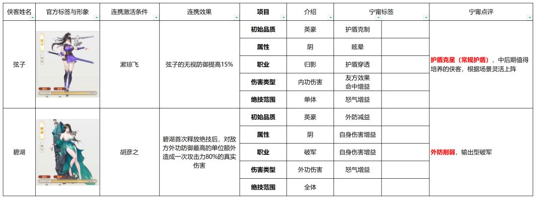 在对局中,合理的搭配能够更好地发挥发挥阵容战力,针对性上阵对策侠客亦能有效提高胜率,因此传统卡牌游戏的强度排行可能并不适用大雷江湖。本篇将全面梳理所有侠客的信息,根据侠客技能机制凝练玩家词条【宁甯词条】,用简单的评价概括侠客特色与定位,帮助萌新快速认识游戏阵容,掌握侠客信息,从而选择自己喜欢的队伍开局起号。