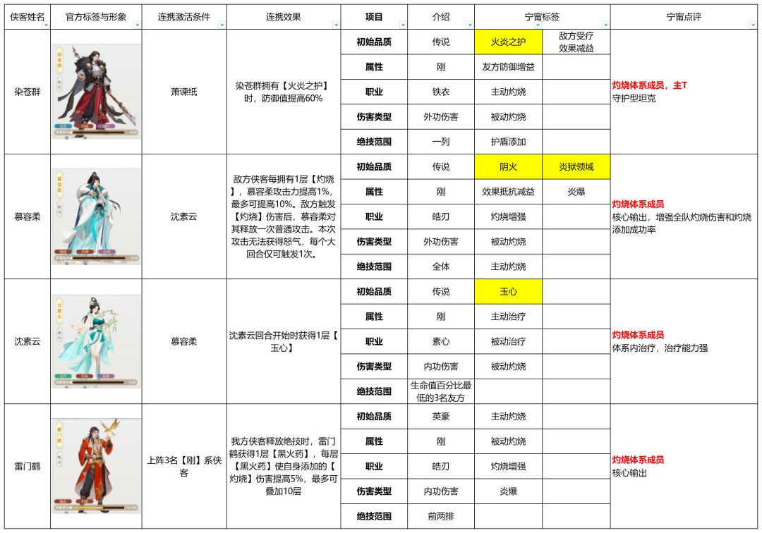 - 主动灼烧:侠客通过普攻、绝技等方式主动向目标添加【灼烧】状态