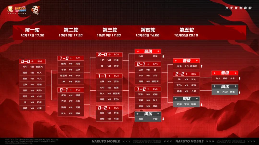 无差别瑞士轮战果速报秋季赛无差别瑞士轮阶段已经结束,经过四天激烈的对决,秋季赛无差别赛道的八强选手已经全部决出!他们分别是小豪、荒芜、尘埃、十六、碧洛天、友人、析夜、大伞,让我们恭喜这八位选手!在此前的比赛中,小豪和荒芜3:0率先拿下晋级资格!而在最后一天的第四轮比赛中,尘埃和碧洛天选手凭借稳定的发挥,以3:0的成绩顺利晋级,十六选手则和对手你追我赶,以3:2的成绩晋级;在第五轮,友人和析夜选手皆苦战五局,并最终获得晋级资格,而大伞以3:0的成绩拿下晋级的最后一个名额!期待选手们能在接下来的秋季赛总决赛中,为我们带来更多惊喜!