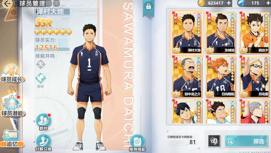 球员养成和队伍编成的入口,为球员升级技能,编辑潜能和追忆,以及关卡上阵队伍的组成。