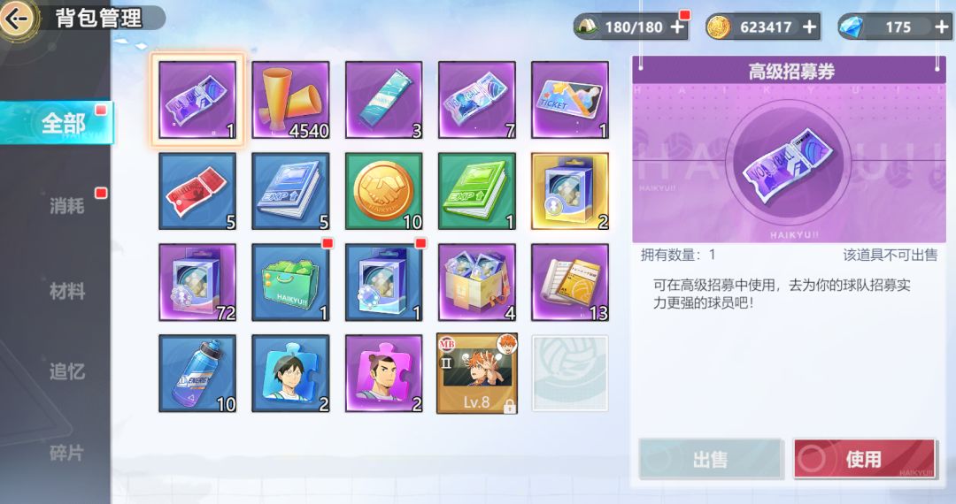 道具一栏,养成素材与追忆等都可以做这里确认,部分礼盒类道具也需要在背包内打开使用