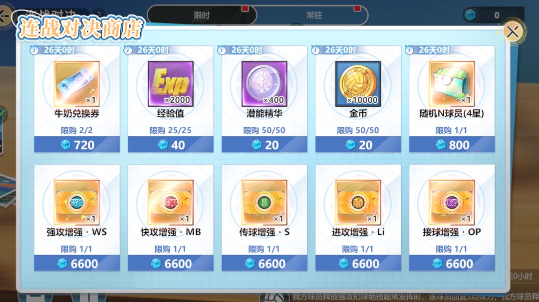 通关限时关卡可获得连战对决徽章的奖励,,可在专属的商店中兑换一些稀有道具。