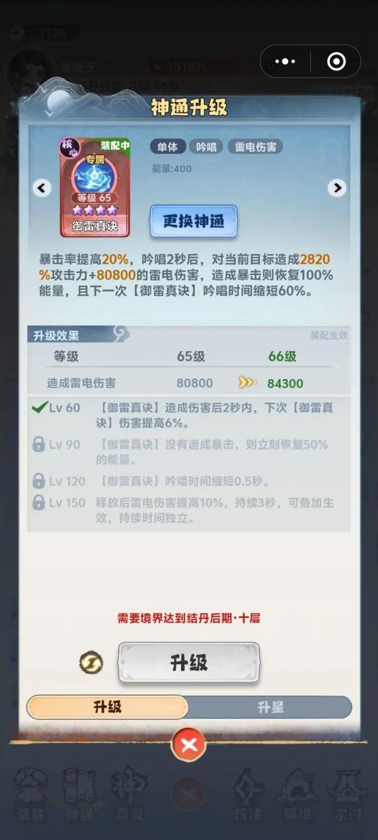 核心神通:御天真绝主动神通:雷灵之体、元磁感应、唤雷决被动神通:御雷暴、御雷扩、正元秘法、雷气真解、万灵之体首先是核心提高暴击率,上限很高劣势就是起手满,要两秒的蓄力时间,不过好在下一次起手蓄力缩短60%下面神通就是搭配缩短的神通和增伤神通,基本可以做到高爆发冷却短的效果至于为什么要搭配雷灵之体,优势在于起手在后蓄力攻击缩短到0.5秒,搭配提高核心神通的神通,可以做到高爆发高冷却。冷却必备技能,yyds,技能一开,搭配雷灵之体,2秒可以做到放3-4个核心神通,伤害爆炸。唤雷决也很重要,开技能后,每放一次核心神通,越打越痛。【主宰世界】凌霄(枪修)的神通搭配
