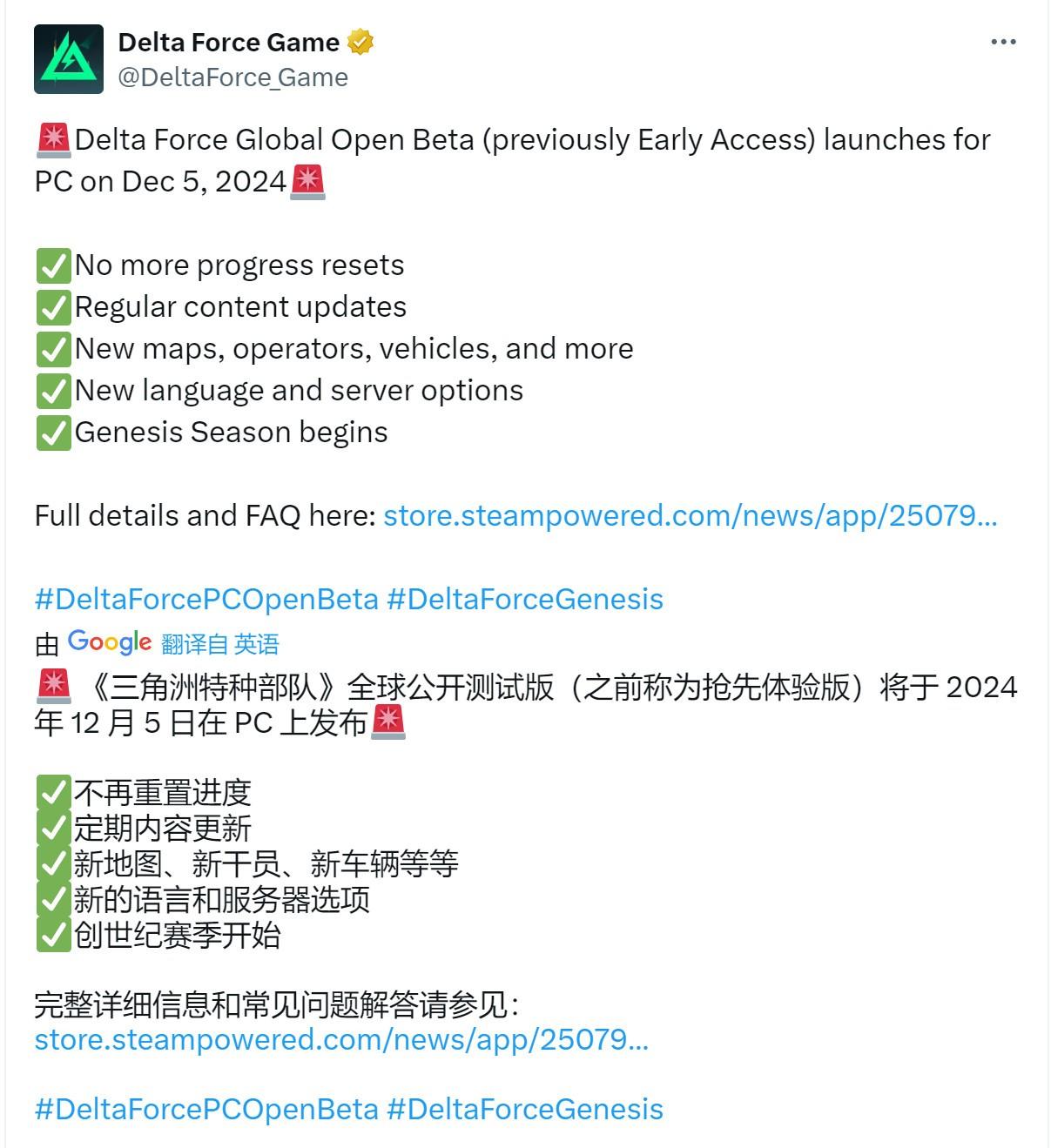 腾讯宣布,《三角洲行动》将于2024年12月5日在PC上(Steam和Epic)展开全球BETA公测。