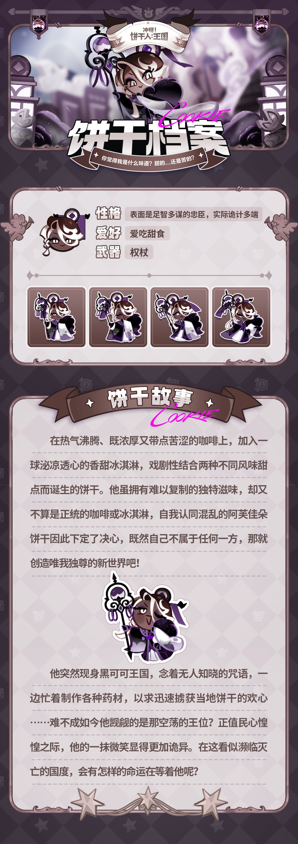 在热气沸腾、既浓厚又带点苦涩的咖啡上,加入一球泌凉透心的香甜冰淇淋,戏剧性结合两种不同风味甜点而诞生的饼干。他突然现身黑可可王国,念着无人知晓的咒语,一边忙着制作各种药材,以求迅速掳获当地饼干的欢心……难不成如今他觊觎的是那空荡的王位?正值饼心惶惶之际,他的一抹微笑显得更加诡异。在这看似濒临灭亡的国度,会有怎样的命运在等着他呢?