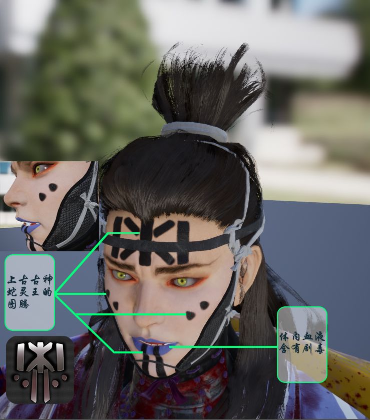 首先我们角色身体内存在着两个灵魂大家应该都知道了!其中一个灵魂是上古灭世古神蛇灵王。蛇灵王在体内,使我们主角总是处于失眠的状态,所以我们的主角眼睛周围有着看起来像眼线和眼影彩妆一样的东西其实是失眠的表现。由于蛇灵王附身的缘故,主角的瞳孔也会变成蛇眼一样的浅黄色,蛇灵王附身的附加效果不止如此,由于蛇灵王的附身使主角的血液充满了剧毒,导致主角的嘴唇都变成了紫色!同时主角脸上、身上的部分皮肤也长了蛇的鳞片,而这些鳞片在脸上最终呈现了蛇灵王的图腾——灭世之纹章。