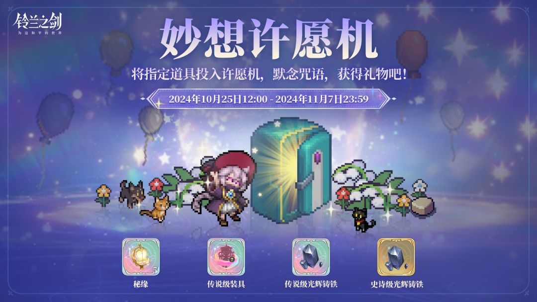 活动期间每日解锁1次新的许愿,一共7次许愿机会。将指定道具放入许愿机即可获取各式光辉铸铁。累计许愿6次后还可获得许愿机的礼物秘缘*5、传说级装具等。