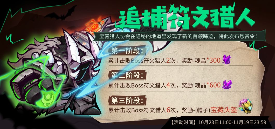 第三阶段:累计击败Boss符文猎人6次,奖励-(帽子)宝藏头盔。
