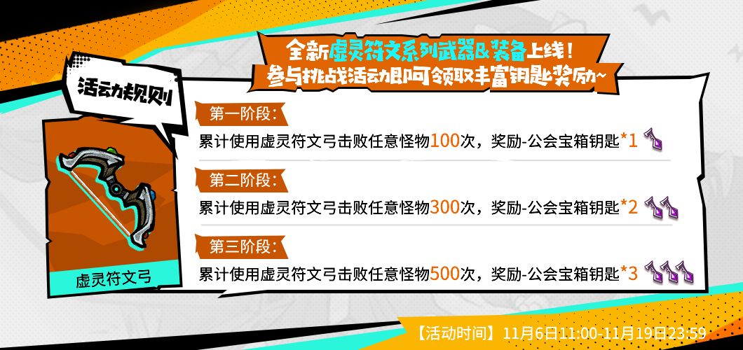 第三阶段:累计使用虚灵符文弓击杀任意怪物500次,奖励-公会宝箱钥匙*3。