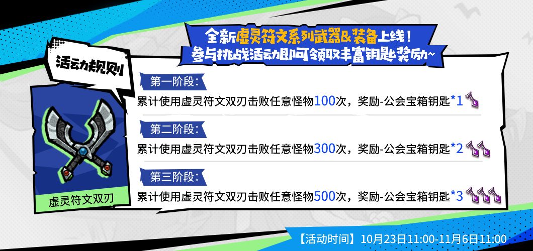 第二阶段:累计使用虚灵符文双刃击杀任意怪物300次,奖励-公会宝箱钥匙*2;
