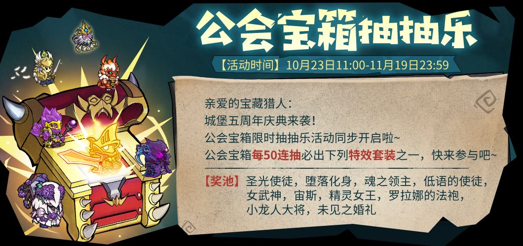 公会宝箱限时抽抽乐活动开启!公会宝箱每50连抽必出下列特效套装之一,快来参与吧~