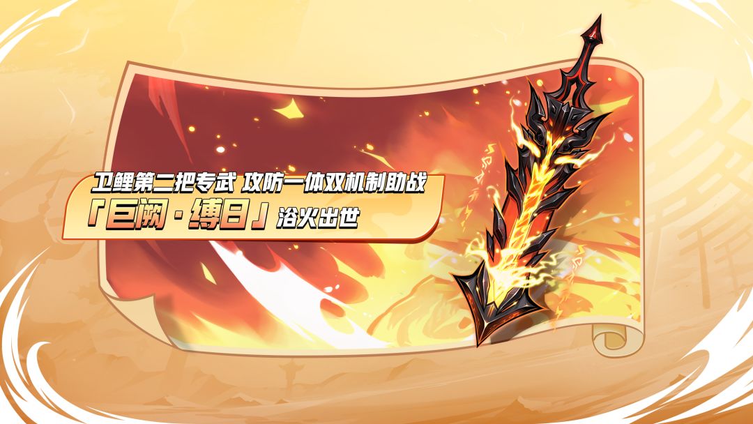 10月24日,卫鲤的第二把专武「巨阙·缚日」与它的幻化「巨阙·吞月」将共同登场,等待忍忍的召唤!或许在千百年的传承中,曾有某段不知名的岁月,这把镇守古国命脉的巨刃,曾以另外的模样展现在世人面前……